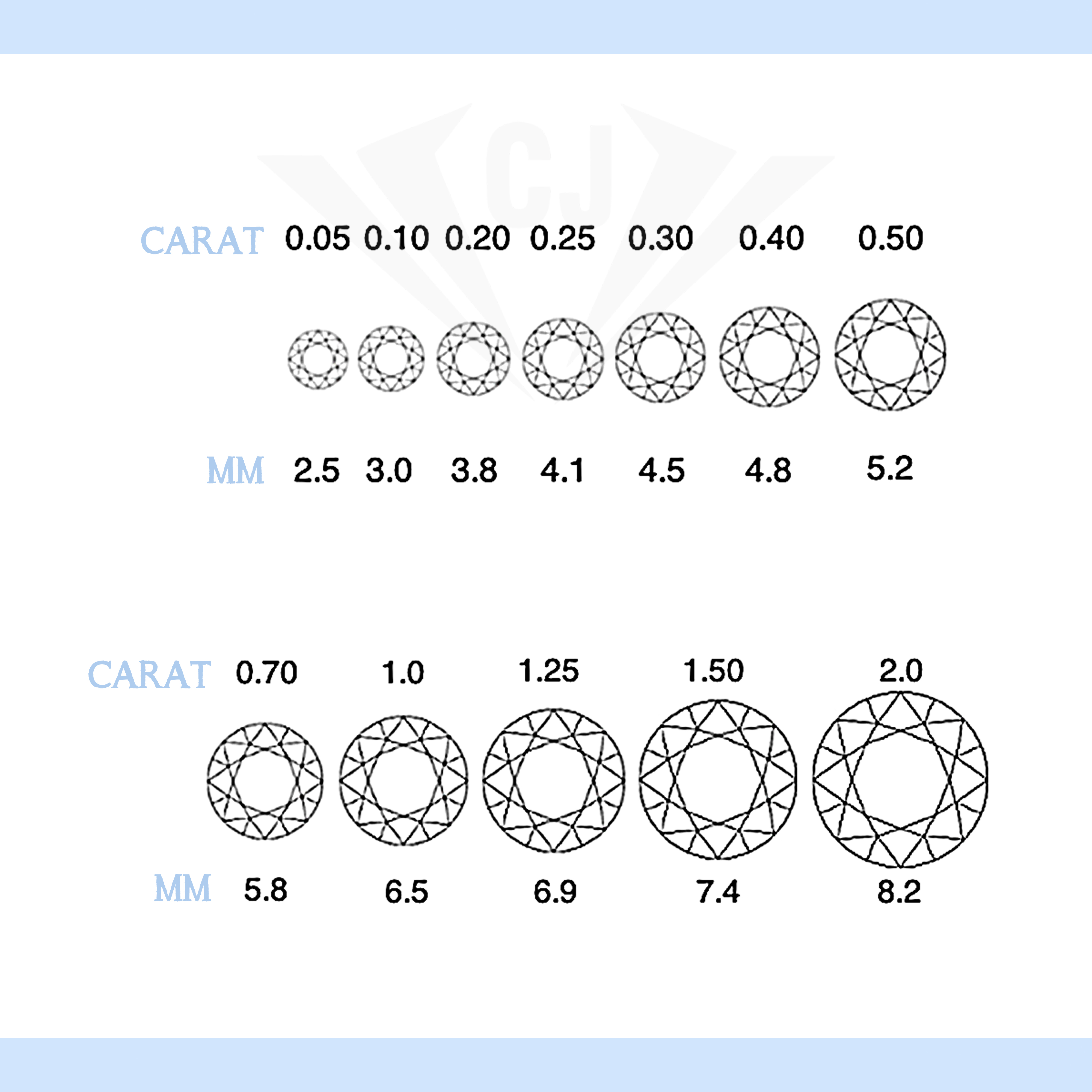 The weight of a diamond is expressed in carats. The word carat originated from the carob tree or Ceratonia siliqua. It is the most important 'C' to be considered while buying a diamond. It offers general guidelines on understanding the pricing of diamonds. Carat is the most misunderstood of the 4Cs. It actually refers to a diamond's weight, not its size. Consider cut and carat together; a larger carat diamond with a poor cut grade can appear smaller than a smaller diamond with a higher cut grade. To maximize your budget, "Buy Shy" this means selecting a carat weight slightly below the whole and half carat marks. For example, instead of a 2.00-carat diamond, consider buying a 1.90-carat weight. This will save a considerable amount of money and the slight size difference will never be noticed.