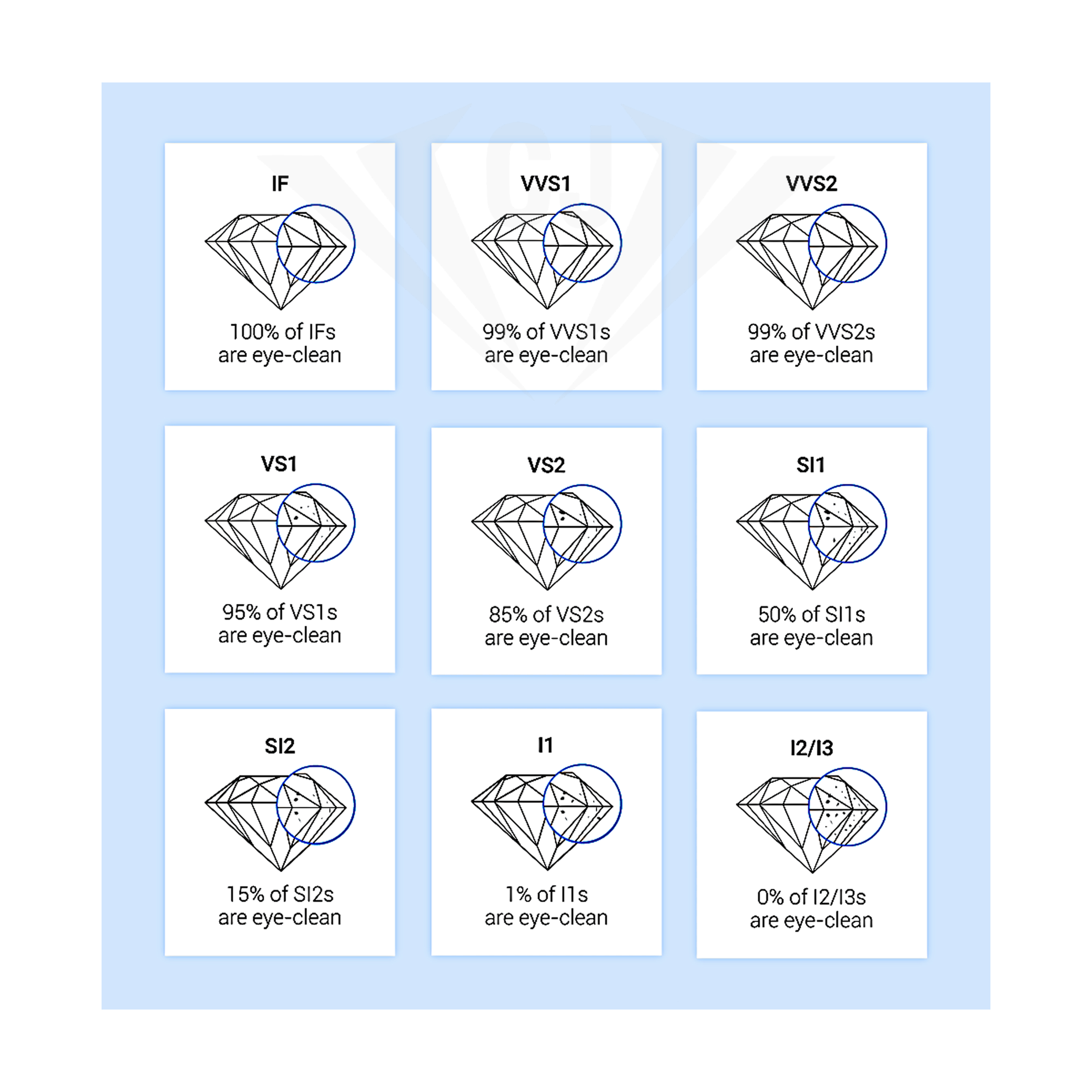 Clarity refers to how clear, or "clean" the diamond is. Diamonds have imperfections which are present in its rough state. Most diamonds have tiny imperfections called inclusions. The fewer and less visible the inclusions, the higher the clarity grade. Diamond clarity is often the least important of the 4Cs because most inclusions are microscopic; they don't affect the diamond's beauty in a visible way. To maximize your budget, consider an "Eye-Clean" diamond, graded VS1 or higher, in which inclusions are invisible to the naked eye.