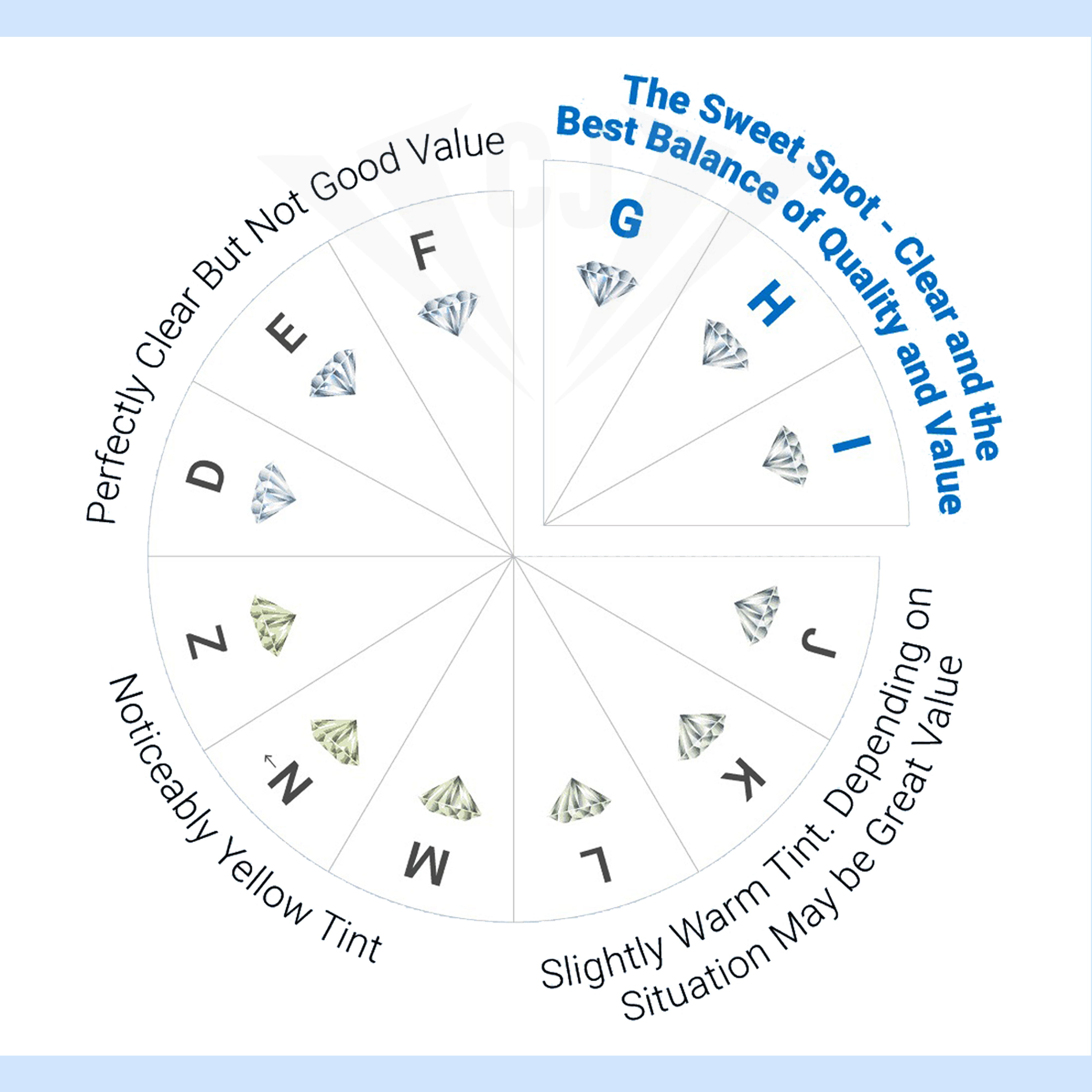 Diamonds allow light to be reflected and dispersed as a rainbow of color. The color is graded from sparkling colorless white towards the more fancy colors. The second most important of the 4Cs is color because it's what the eye notices next after sparkle. A diamond's color actually refers to its lack of color. The less color, the higher the color grade.